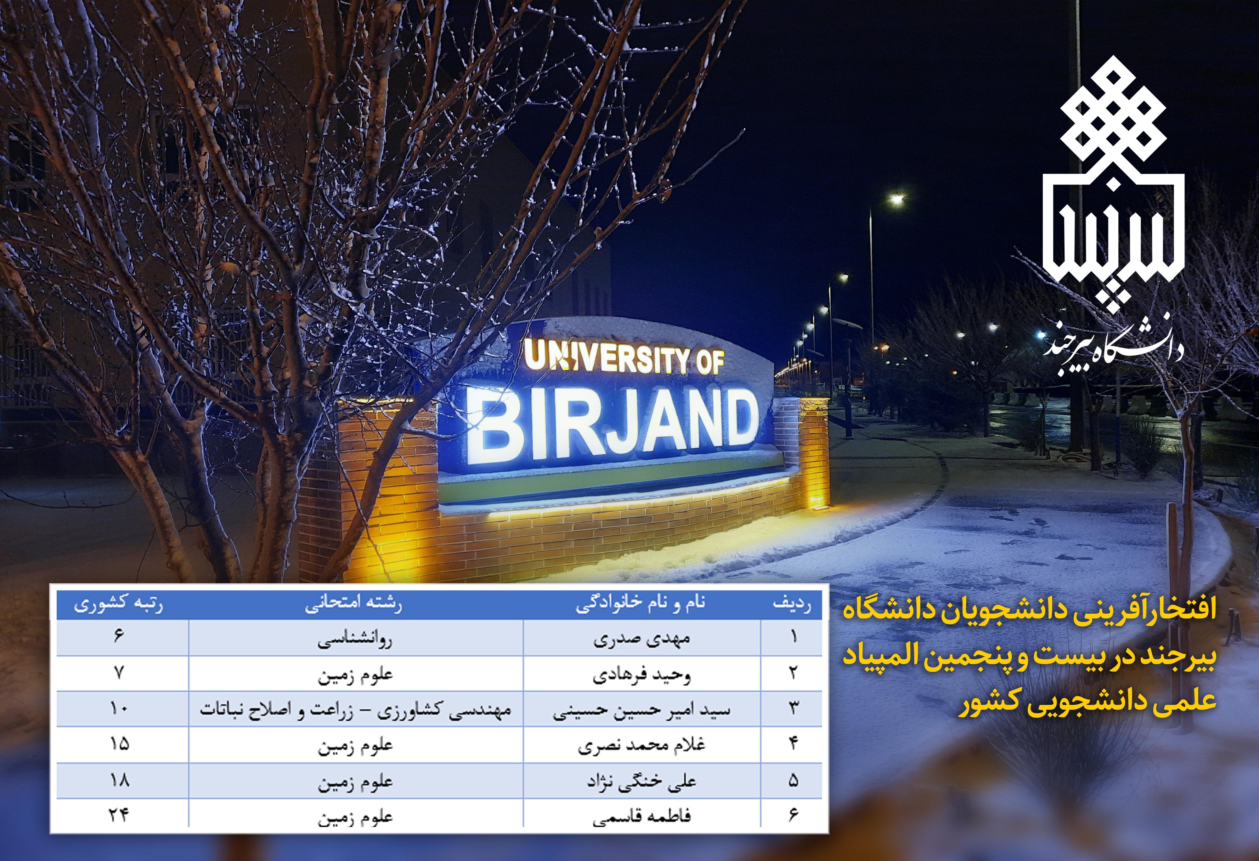 به گزارش روابط عمومی و اطلاع‌رسانی دانشگاه بیرجند، دکتر سیده عاطفه حسینی،  رئیس گروه امور هدایت استعدادهای درخشان  با اعلام خبر افتخار آفرینی دانشجویان دانشگاه بیرجند در بیست و پنجمین المپیاد علمی دانشجویی کشور گفت: تمامی دانشجویان اعزامی از دانشگاه بیرجند به مرحله نهایی بیست و پنجمین المپیاد علمی دانشجویی کشور موفق به کسب رتبه‌های برتر کشوری شدند.