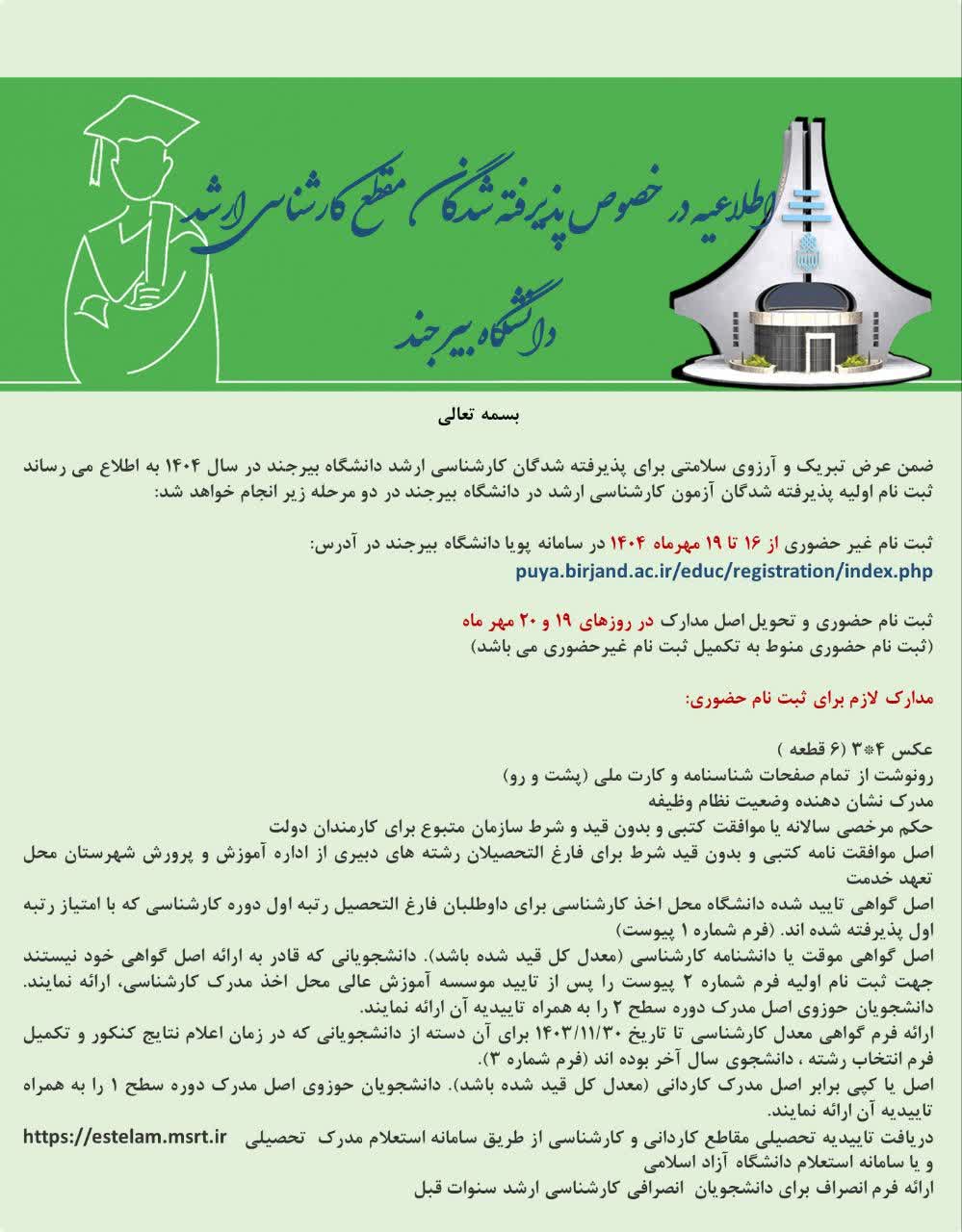 اطلاعیه در خصوص پذیرفته شدگان مقطع کارشناسی ارشد دانشگاه بیرجند ۱۵ مهر ۱۴۰۴ | ۱۳:۰۰ کد : ۳۲۰۲۸ اطلاعیه ها اطلاعیه های مهم ارسال به دیگران نام شما ایمیل شما ایمیل دریافتکننده ارسال انصراف تعداد بازدید:۸۸۶ ضمن تبریک به پذیرفته شدگان کارشناسی ارشد دانشگاه بیرجند در سال ۱۴۰۴ برای اطلاع از فرایند ثبت نام تصویر را مطالعه فرمایید.