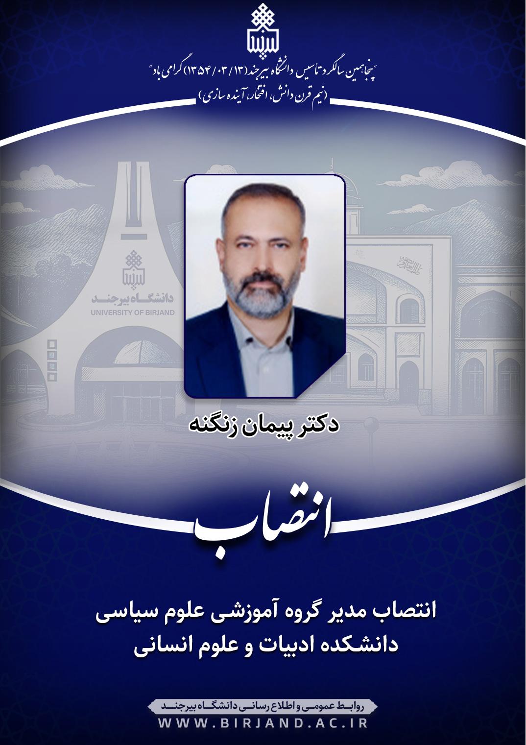 دکتر احمد خامسان، سرپرست دانشگاه بیرجند، براساس ابلاغی، دکتر پیمان زنگنه، عضو هیأت علمی گروه آموزشی علوم سیاسی دانشکده ادبیات و علوم انسانی را به سمت مدیر گروه آموزشی علوم سیاسی این دانشکده به مدت دو سال منصوب کرد.