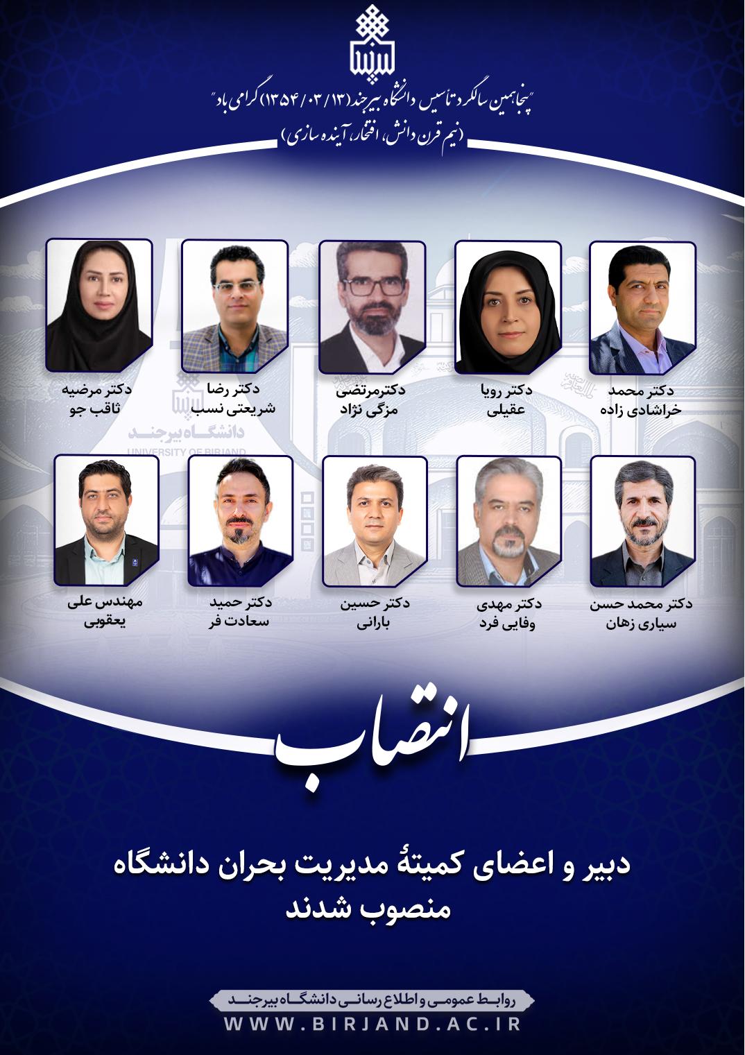 دکتر احمد خامسان، سرپرست دانشگاه بیرجند براساس ابلاغ‌های جداگانه‌ای، دکتر رضا شریعتی‌نسب، معاون اداری و مالی دانشگاه، دکتر محمدحسن سیاری‌زهان، معاون آموزشی و تحصیلات تکمیلی، دکتر حسین بارانی، معاون دانشجویی، دکتر مرضیه ثاقب جو، معاون پژوهش، فناوری و نوآوری دانشگاه، دکتر مهدی وفائی فرد، سرپرست معاونت فرهنگی و اجتماعی، دکتر محمد خراشادی‌زاده، مدیر برنامه، بودجه و تحول اداری، دکتر رویا عقیلی، رئیس کمیته بازرسی شورای سلامت، ایمنی و محیط زیست، مهندس علی یعقوبی، مدیر امور فنی و نظارت بر طرح های عمرانی دانشگاه، دکتر حمید سعادت‌فر، مدیر توسعه فناوری اطلاعات، امنیت و هوشمندسازی به عنوان اعضای کمیته و دکتر مرتضی مزگی‌نژاد، مدیر حراست به عنوان دبیر کمیته مدیریت بحران دانشگاه به مدت دوسال منصوب شدند.