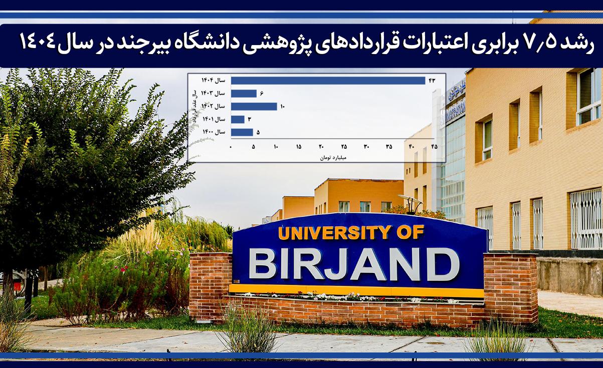 آمار طرح‌های پژوهشی برون‌دانشگاهی دانشگاه بیرجند نشان می‌دهد اعتبارات قراردادهای پژوهشی این دانشگاه در سال ۱۴۰۴ با جهشی چشمگیر به بیش از ۴۳ میلیارد تومان رسیده است؛ رشدی که در مقایسه با سال گذشته حدود ۷.۵ برابر افزایش را نشان می‌دهد.